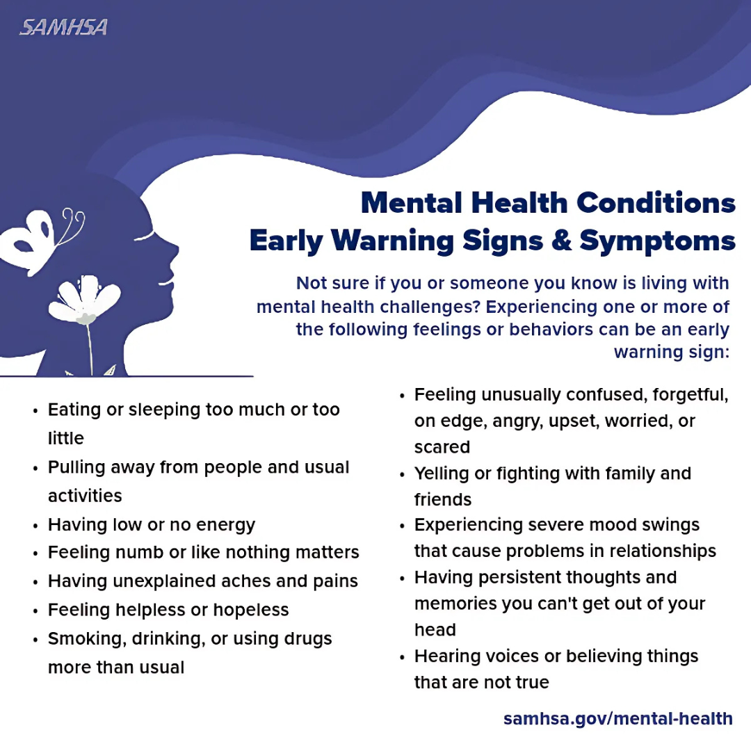 Many communities are taking on campaigns to support the mental health youth, elders and in the workplace. Through call centers like 988, text lines, and local care campaigns, I hope that we can reach anyone who feels like they need a service. Mental health does not mean you are crazy. It means you might need some guidance and/or medication to support your brain through a period of time. If my arm were bleeding, folks would rush in to help, provide a pressure bandage, or a tourniquet. They might call 911 for a higher level of care. The same should be commonplace for a brain condition. It’s something that you cannot see, but that doesn’t mean it isn’t there. Here are a few signs and symptoms to help you recognize a mental health matter: